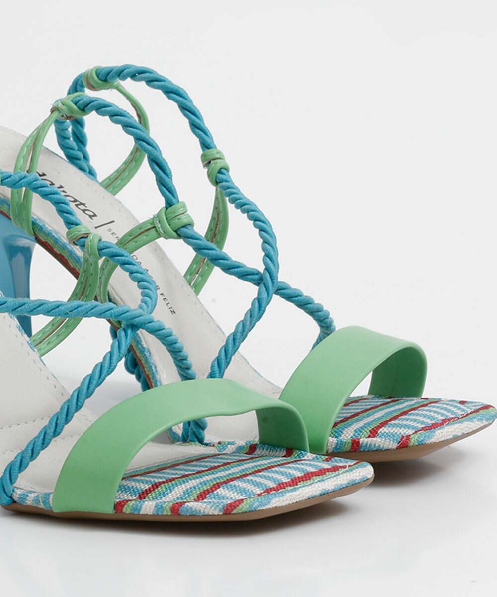 Sandália feminina, confeccionada em material sintético, tiras no cabedal, salto alto fino e fechamento por amarração.