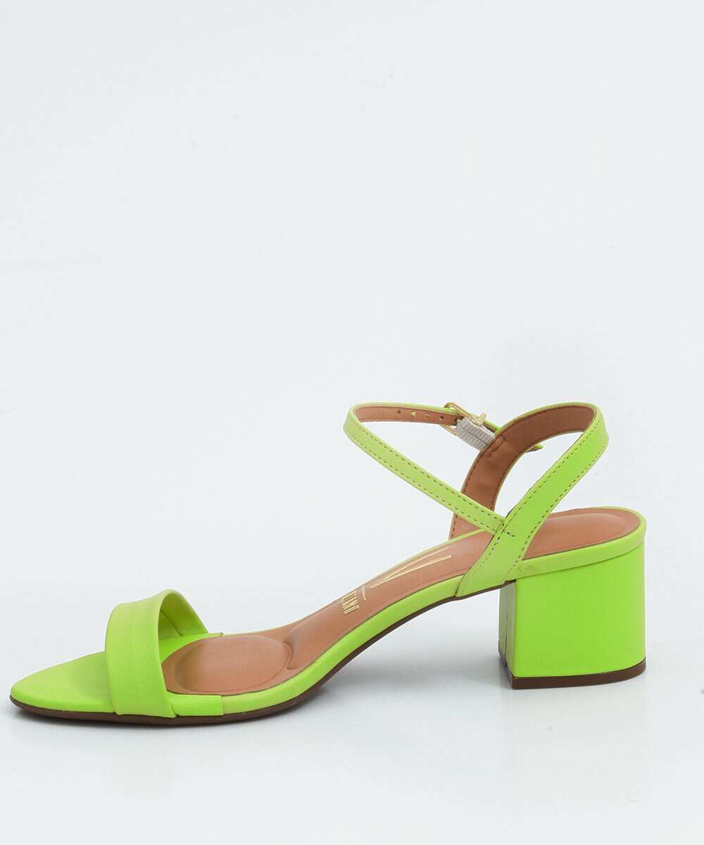 Sandália feminina, confeccionada em material sintético, salto baixo grosso e fechamento por fivela.