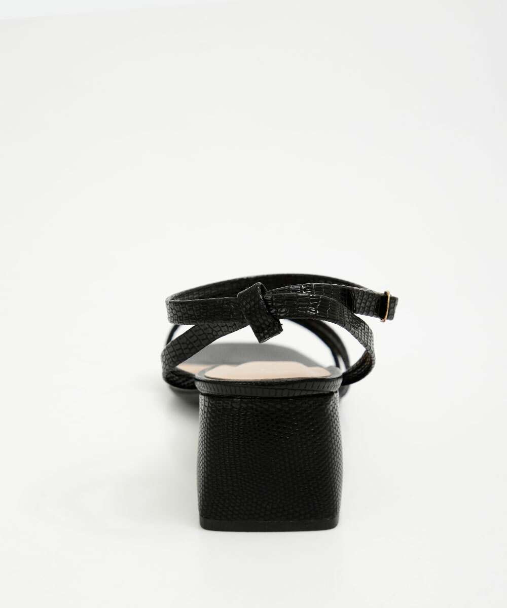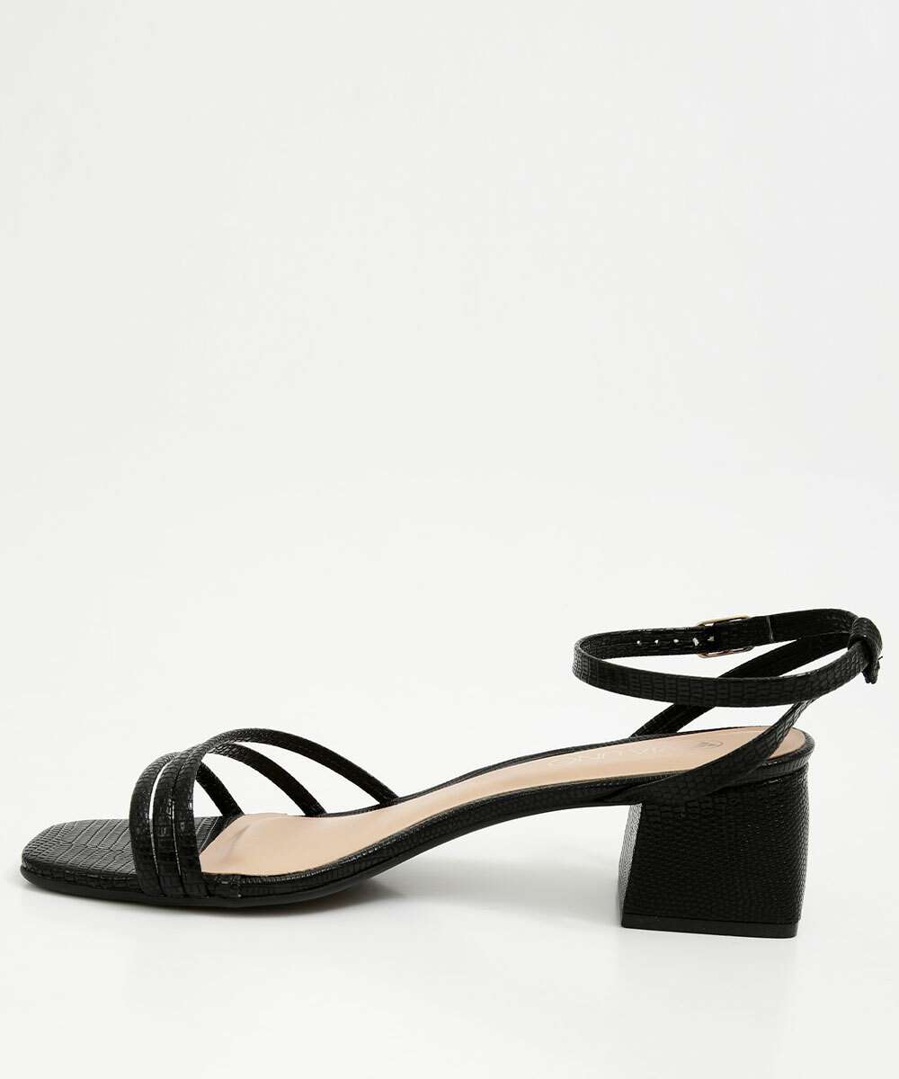 Sandália feminina, confeccionada em material sintético com textura, tiras no cabedal, salto grosso e fechamento por tira com fivela de metal com níveis de ajustes.