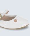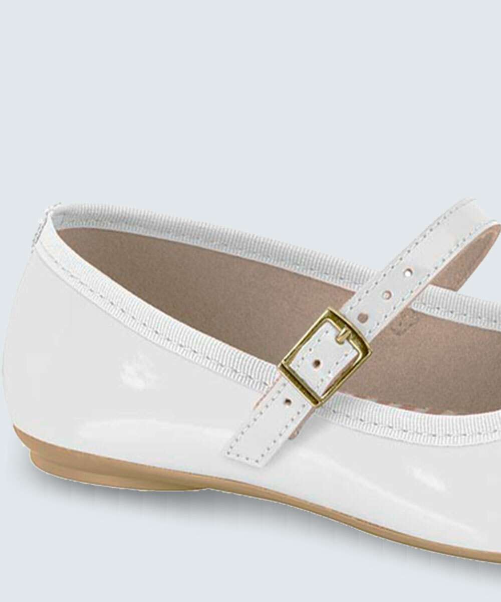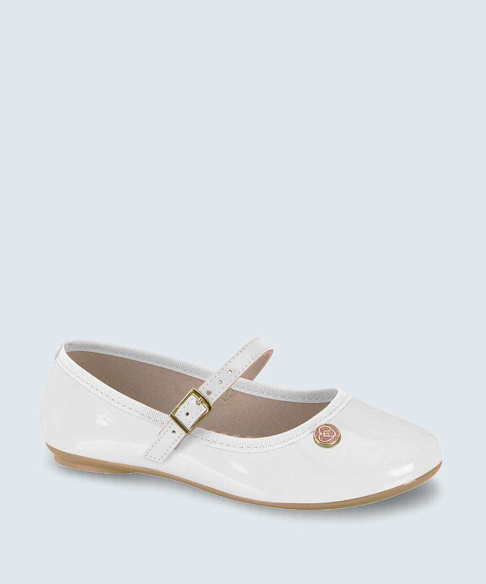 Sapatilha infantil modelo boneca, confeccionada em material sintético com verniz, bico redondo e fechamento por fivela.