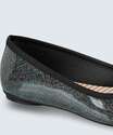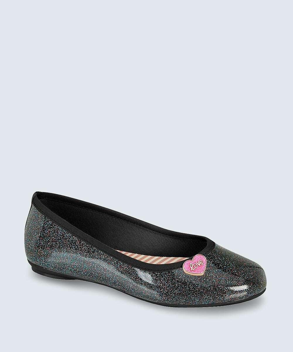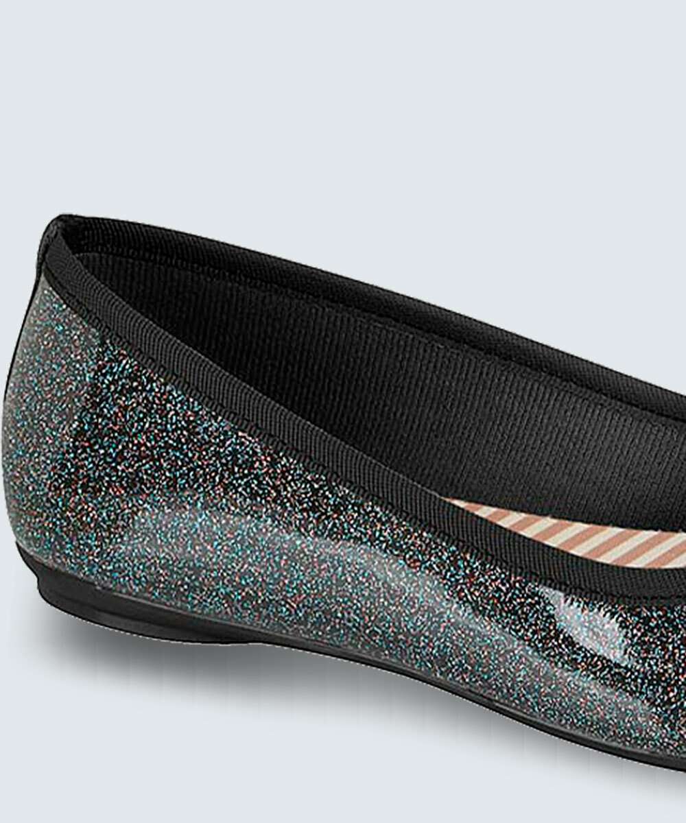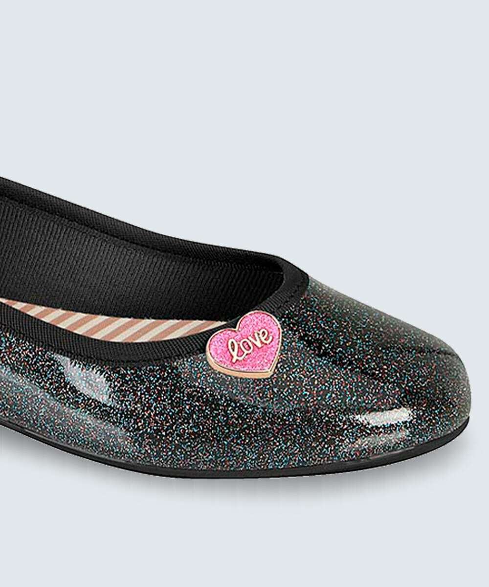 Sapatilha infantil modelo slipper, confeccionada em material sintético com verniz, brilho e bico redondo.