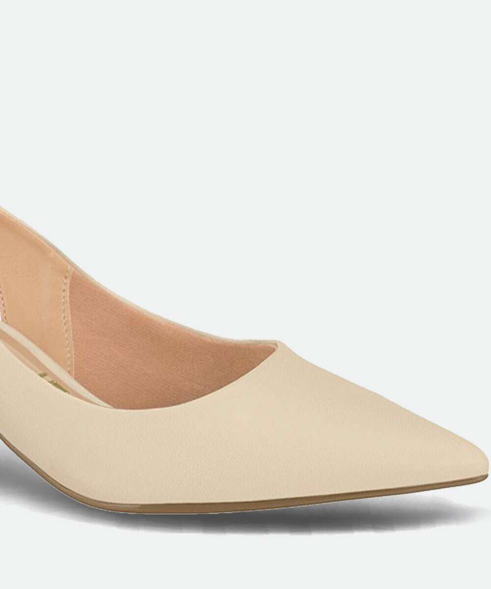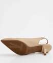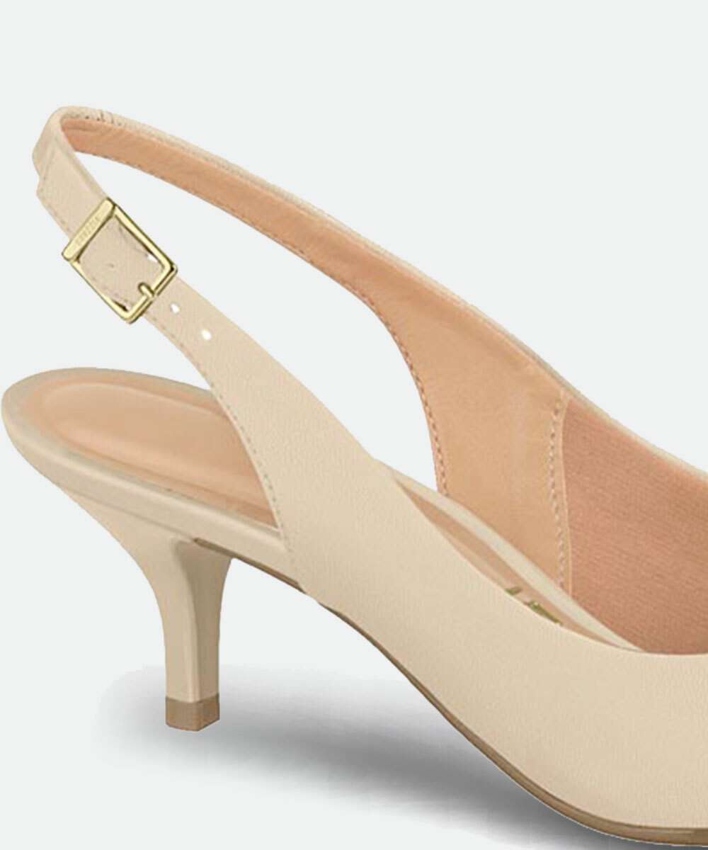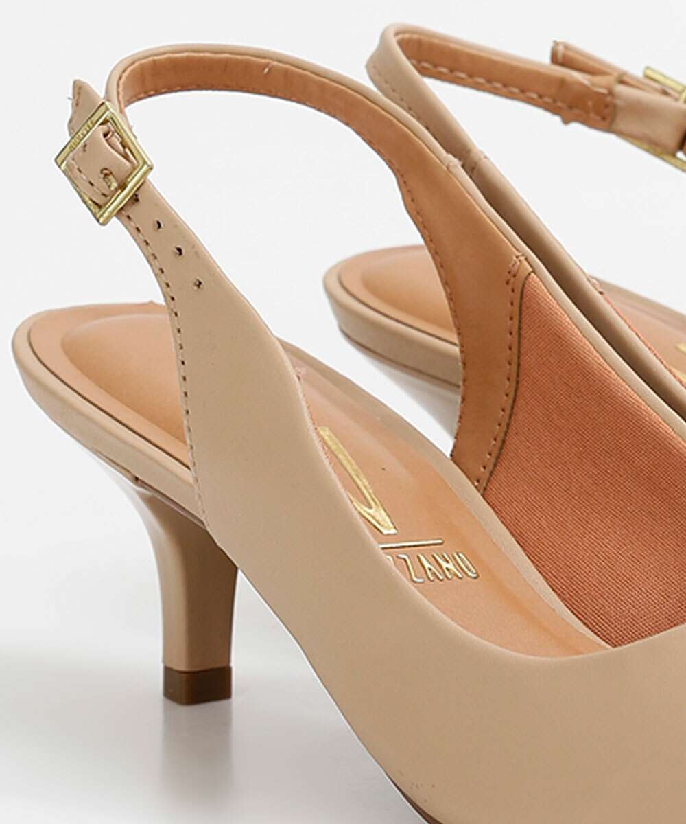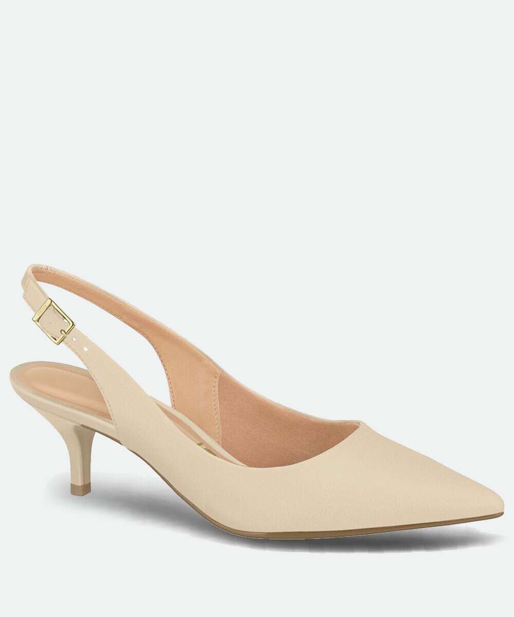 Scarpin feminino slingback, confeccionado em material sintético, salto baixo fino, bico fino e fechamento por fivela.