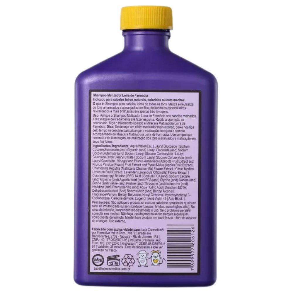 Shampoo Matizador Loira de Farmácia 250ml Lola CosmeticsO Shampoo Matizador Loira de Farmácia 250ml da Lola Cosmetics é um produto especialmente desenvolvido para atender às necessidades dos cabelos loiros, oferecendo um tratamento eficaz para neutralizar e matizar tons amarelados indesejados. A matização dos tons amarelados é acompanhada por uma hidratação profunda, que auxilia na recuperação da saúde capilar, fortalecendo os fios e reduzindo a quebra. O resultado é um cabelo mais saudável, com aspecto revitalizado e brilho intenso. Sua ação antioxidante protege os fios dos danos causados pelos radicais livres e agentes externos, como poluição e raios solares, preservando a cor e a saúde dos cabelos. Ativos:Acid Violet 43: Pigmento violeta intenso que age diretamente na fibra capilar, neutralizando os tons amarelados e alaranjados dos cabelos loiros. Ele proporciona uma ação efetiva de matização, deixando os fios com uma cor mais fria e platinada. Extrato de Damasco: Possui propriedades hidratantes, ajudando a manter a saúde e a maciez dos fios. Penetra na estrutura capilar, promovendo uma hidratação profunda e duradoura, evitando o ressecamento e proporcionando um cabelo mais sedoso e maleável. Modo de Uso:Aplique nos cabelos molhados e massageie delicadamente até fazer espuma. Repita a operação se necessário. Siga o tratamento usando a Máscara Matizadora Loira de Farmácia. Se desejar um efeito matizador mais intenso, deixe nos fios pelo tempo necessário para alcançar a matização desejada e sempre acompanhado da Máscara Matizadora Loira de Farmácia. Associações:Linha Loira de Farmácia. Precauções:Mantenha fora do alcance das crianças. Proteja da luz solar, do calor e da umidade. Descontinue o uso em caso de sensibilização e procure auxílio médico. Uso externo. Características Gerais do Produto: Anvisa: 25351.881358/2016-91Funções do Produto: Neutralização de Cor, ProteçãoZonas de Aplicação: CabeloTipo de cabelo: Loiros, Descoloridos Acompanha o produto: 01 Shampoo Matizador Loira de Farmácia 250ml Lola Cosmetics