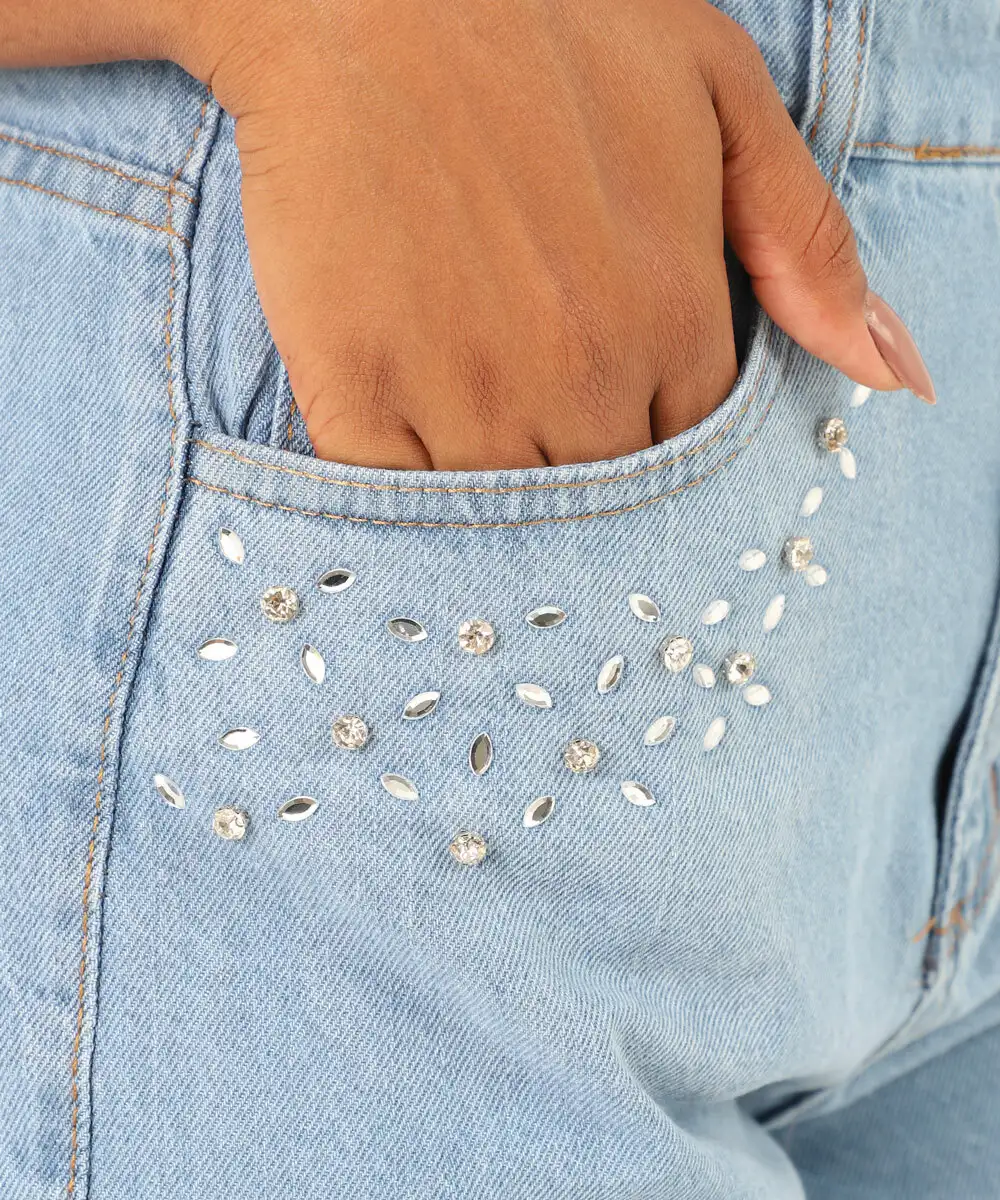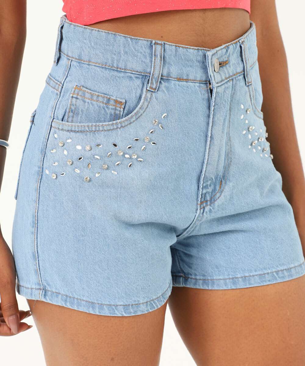 Short Feminino Jeans Strass Bolsos Azul