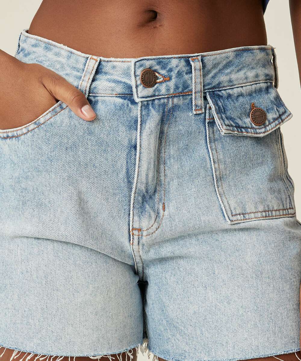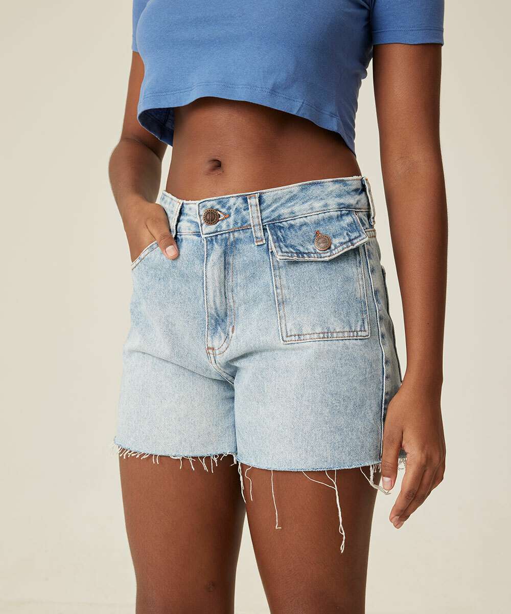 Modelo: Short Jeans Feminino Cintura Alta Bolsos Marisa
