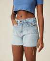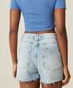 Short feminino, confeccionado em tecido plano jeans. Possui cintura alta, fechamento por botão e zíper no entremeio, cós com passantes, barra desfiada, bolsos frontais e atrás, acabamento no tom e costura contrastante.