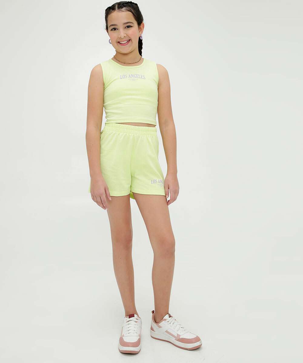 Short juvenil, ideal para meninas de 10 até 16 anos de idade, confeccionado em malha moletinho sem forro. Possui cós elástico, estampa frase próximo à barra, acabamento e costura no tom.