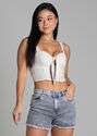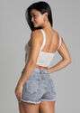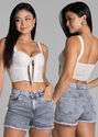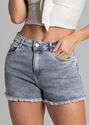Short feminino desenvolvido em jeans A modelagem tem quadril soltinho. Bolsos frontais e posteriores funcionais O cós tem passantes e fechamento por zíper e botão A barra tem acabamento desfiado. Tecido: jeans Tipo de lavagem: marmorizada médio Cor: cinza