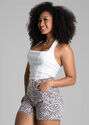 Shorts confeccionada em sarja. Modelagem soltinho. Cintura média Fechamento com botão e zíper Bolsos frontais e bolsos traseiros funcionais Barra simples Tecido: Sarja Tipo de lavagem: Color Cor: Animal print