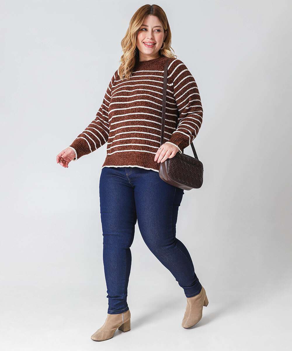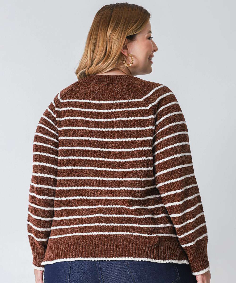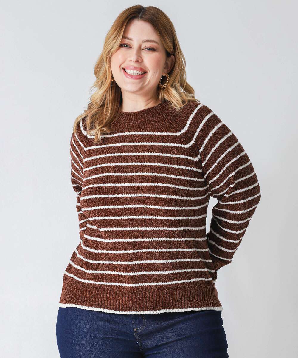 Suéter Plus Size Feminino Chenille Listrado Marisa Marrom