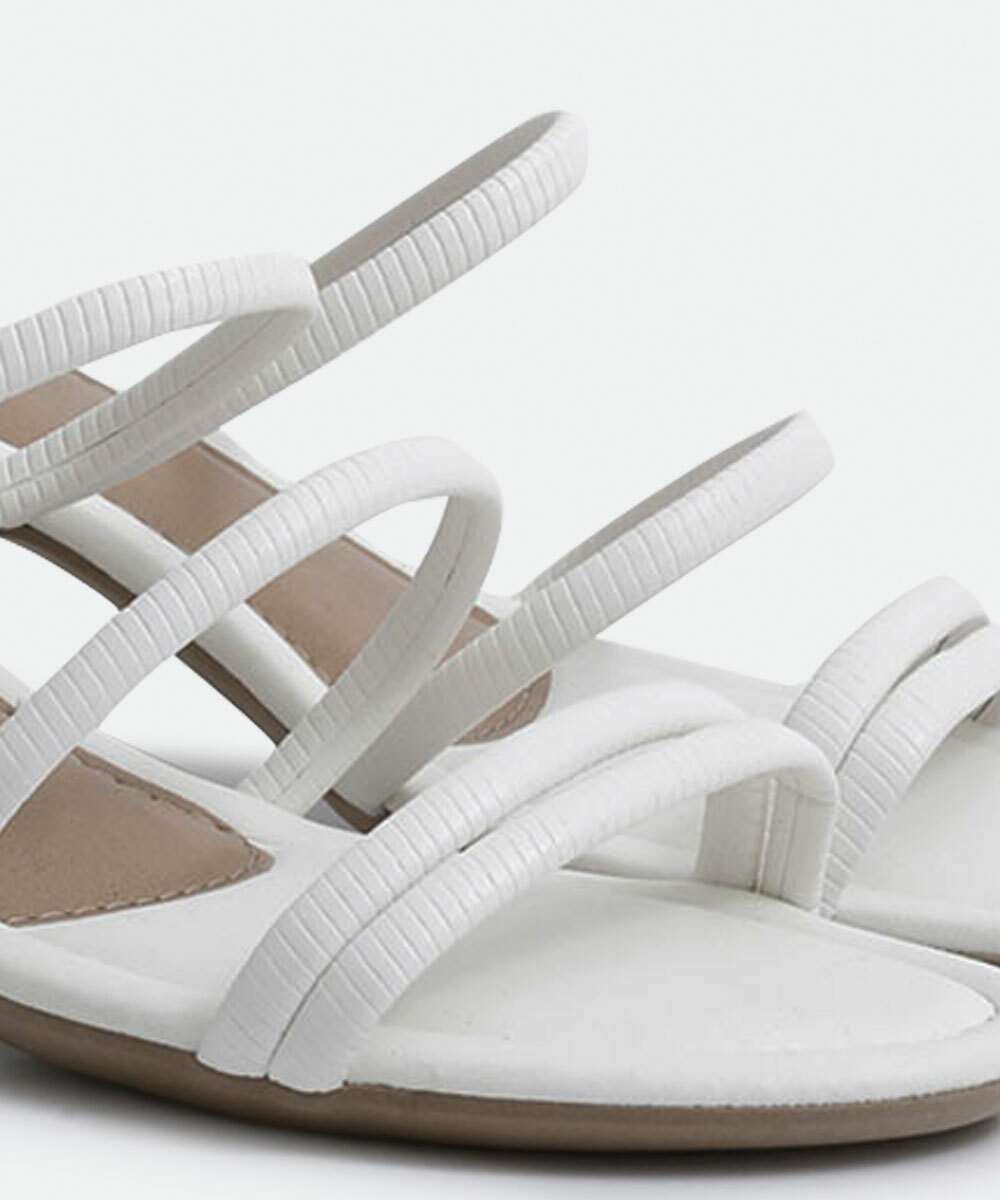 Tamanco feminino, confeccionado em material sintético, tiras com textura no cabedal e salto baixo grosso.
