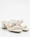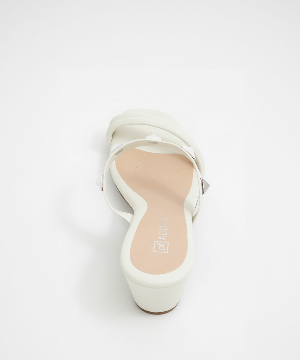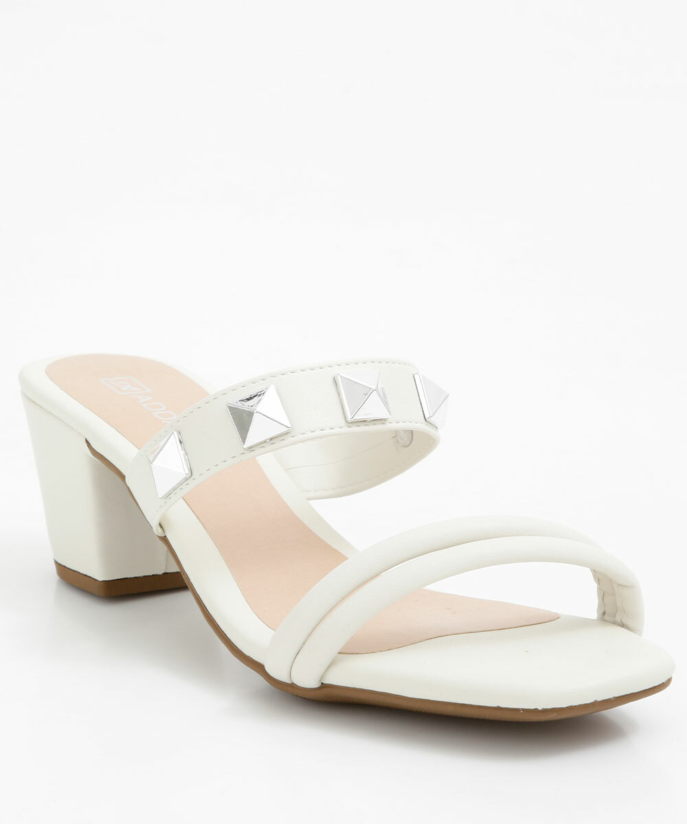 Tamanco feminino, confeccionado em material sintético, tiras finas no cabedal, aplicação de tachas e salto grosso.