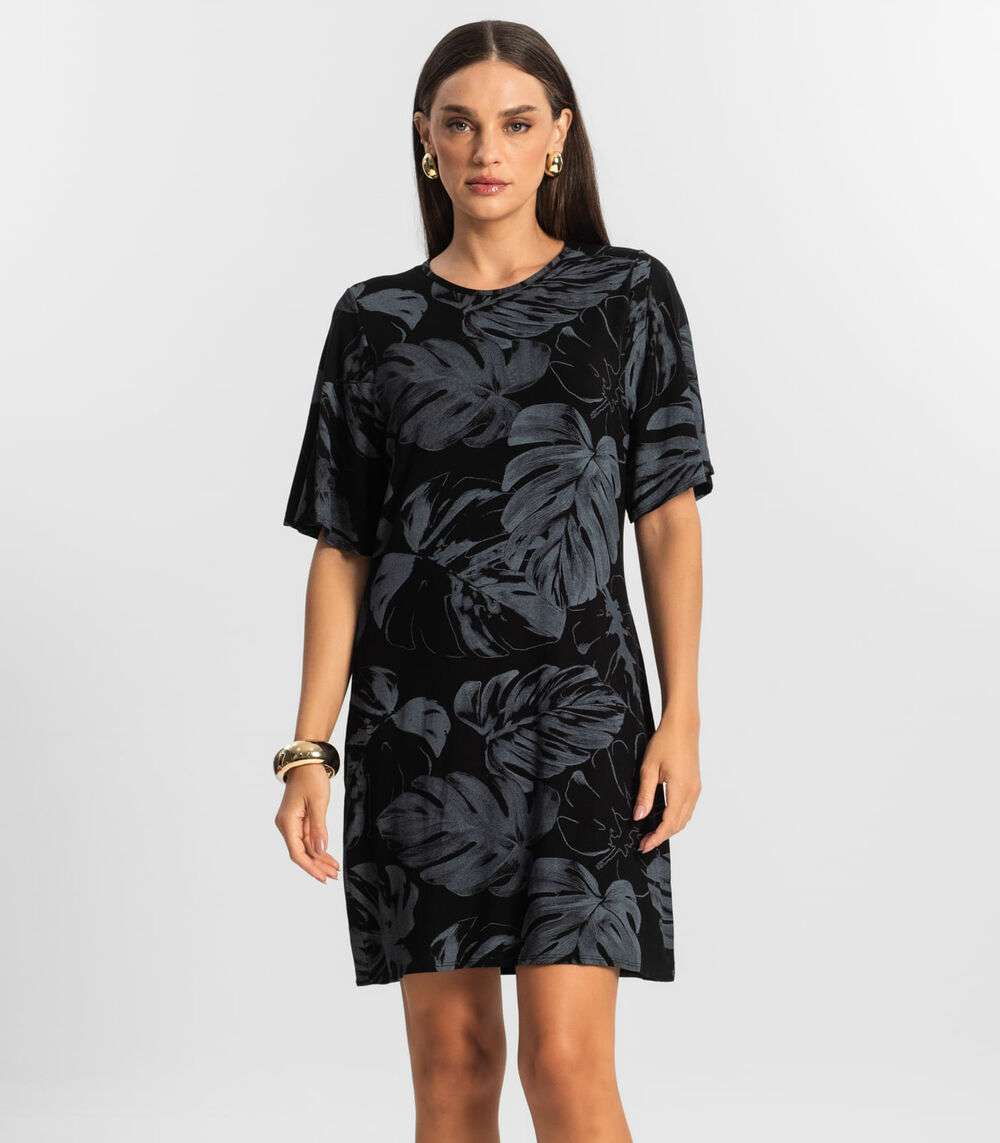 O Vestido Feminino Rovitex é confeccionado em Malha Visco Premiere, garantindo conforto e estilo. Seu design apresenta mangas amplas, decote redondo e uma encantadora estampa rotativa de folhas. Com um comprimento acima do joelho, é a escolha perfeita para um look elegante e descontraído.