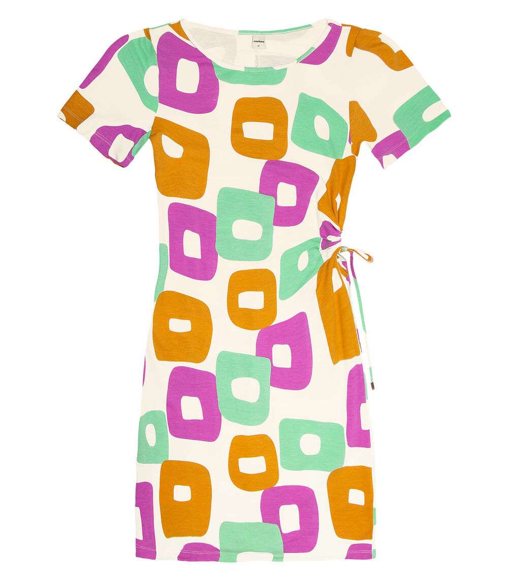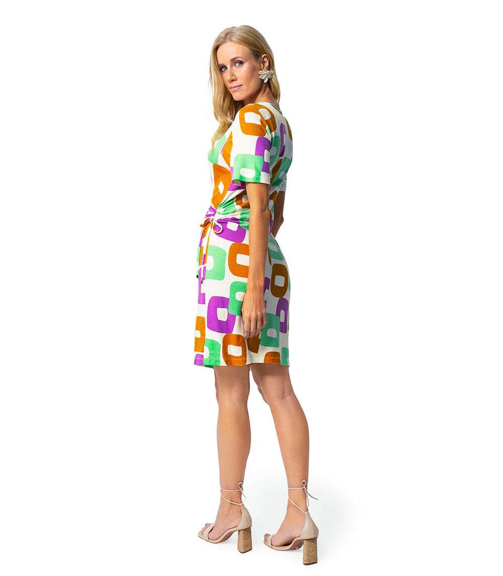 Vestido desenvolvido em Molecotton de Viscose com estampa rotativa . Modelagem justa com mangas curtas e decote canoa. Possui detalhe franzido com friso na lateral. Comprimento acima dos joelhos. Peça confortável e sofisticada, ideal para ocasiões especiais. Combine com: sandálias e acessórios.