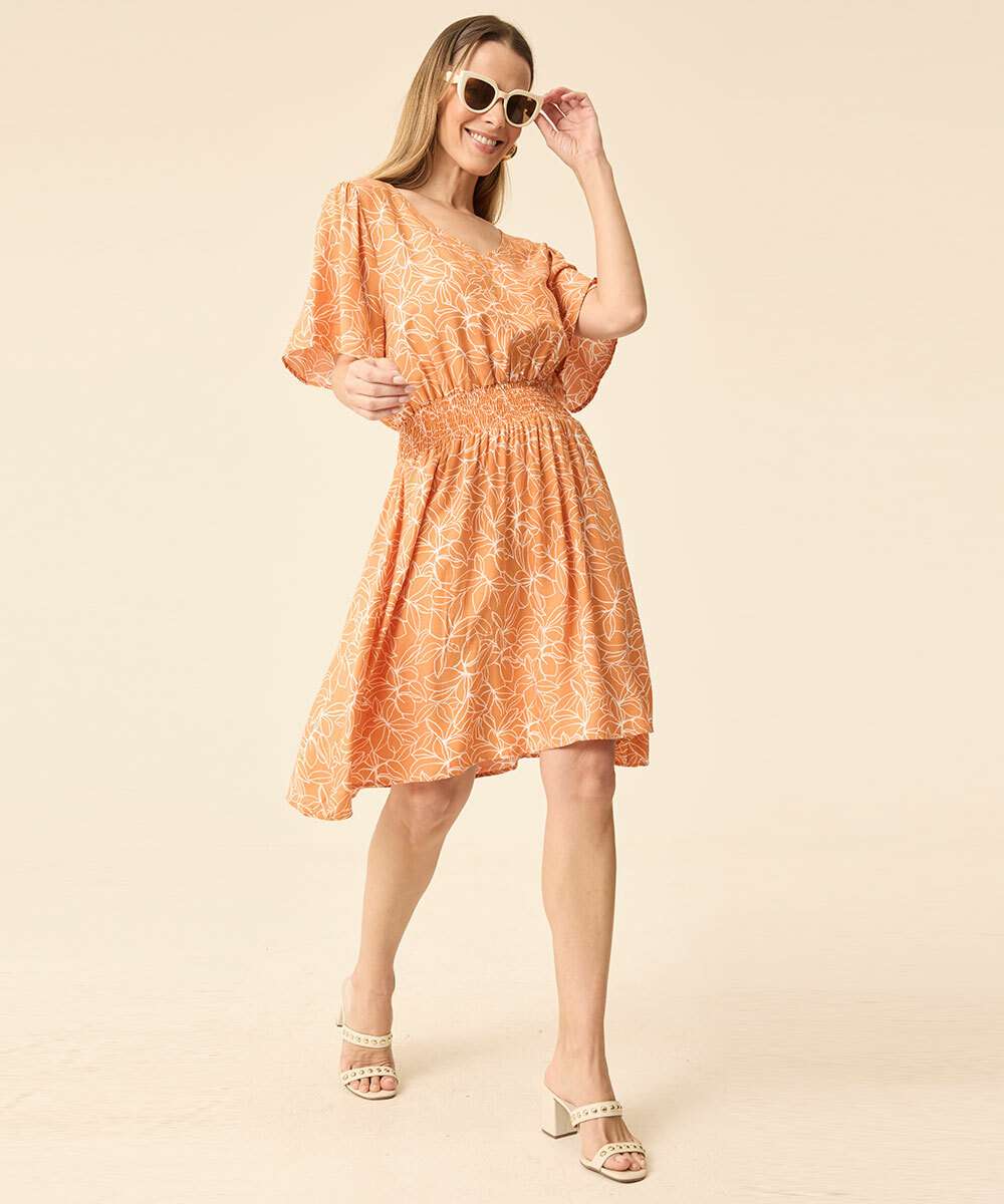 Vestido feminino, confeccionado em tecido plano poliéster. Possui estampa flores, decote V, lastex para melhor ajuste na cintura, manga curta, acabamento e costura no tom.
