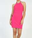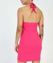 Vestido feminino modelo tubinho, confeccionado em malha canelada. Possui decote halter neck, frente única com alças finas para amarração no pescoço, acabamento e costura no tom.