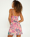 Vestido feminino confeccionado em malha poliéster eelastano, forro em poliéster e sobreposição em tule. Possui estampa, decote v, alças finas ajustáveis, detalhe de amarração, acabamento no tom e barra sem costura.