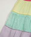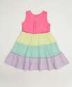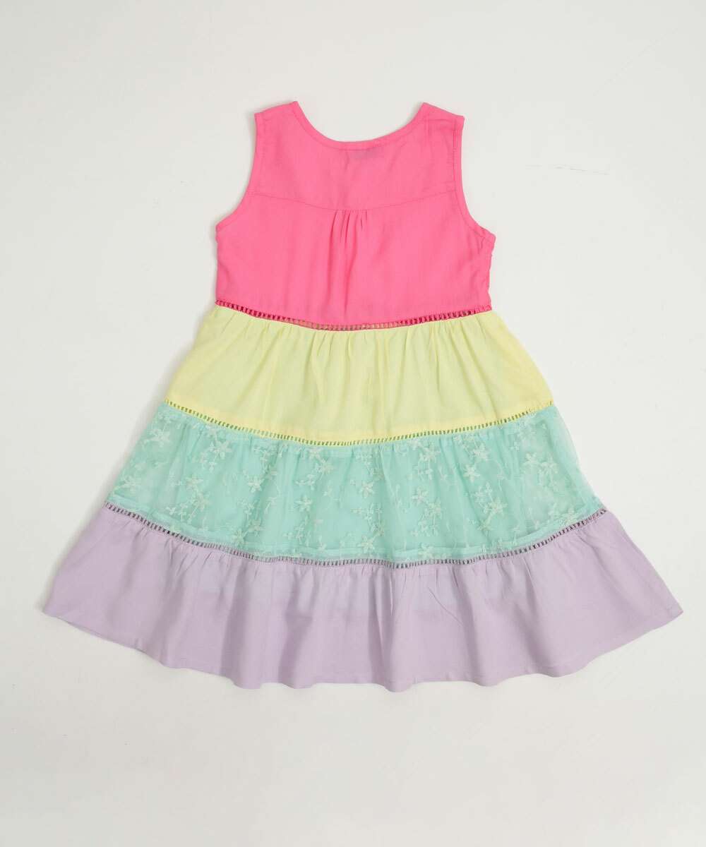 Vestido infantil, ideal para meninas de 01 até 04 anos de idade, confeccionado em malha viscose, algodão e poliéster. Possui decote redondo, botões no entremeio, bordados, recorte em tons contrastantes, sem manga, acabamento e costura no tom.