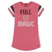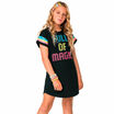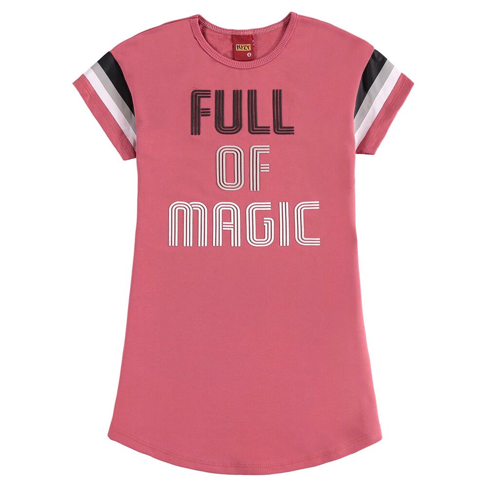 Vestido Infantil Kyly confeccionado em Moletinho, possui modelagem shift, estampa frontal com detalhes em relevo e mangas com listras coloridas.
