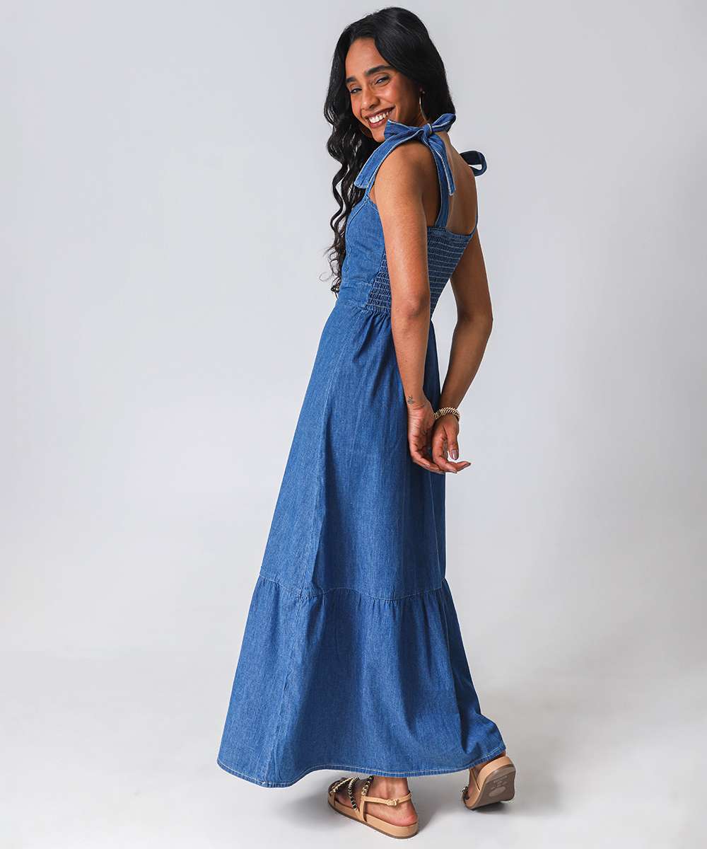 Vestido Jeans Longo Lastex Feminino Marisa Azul