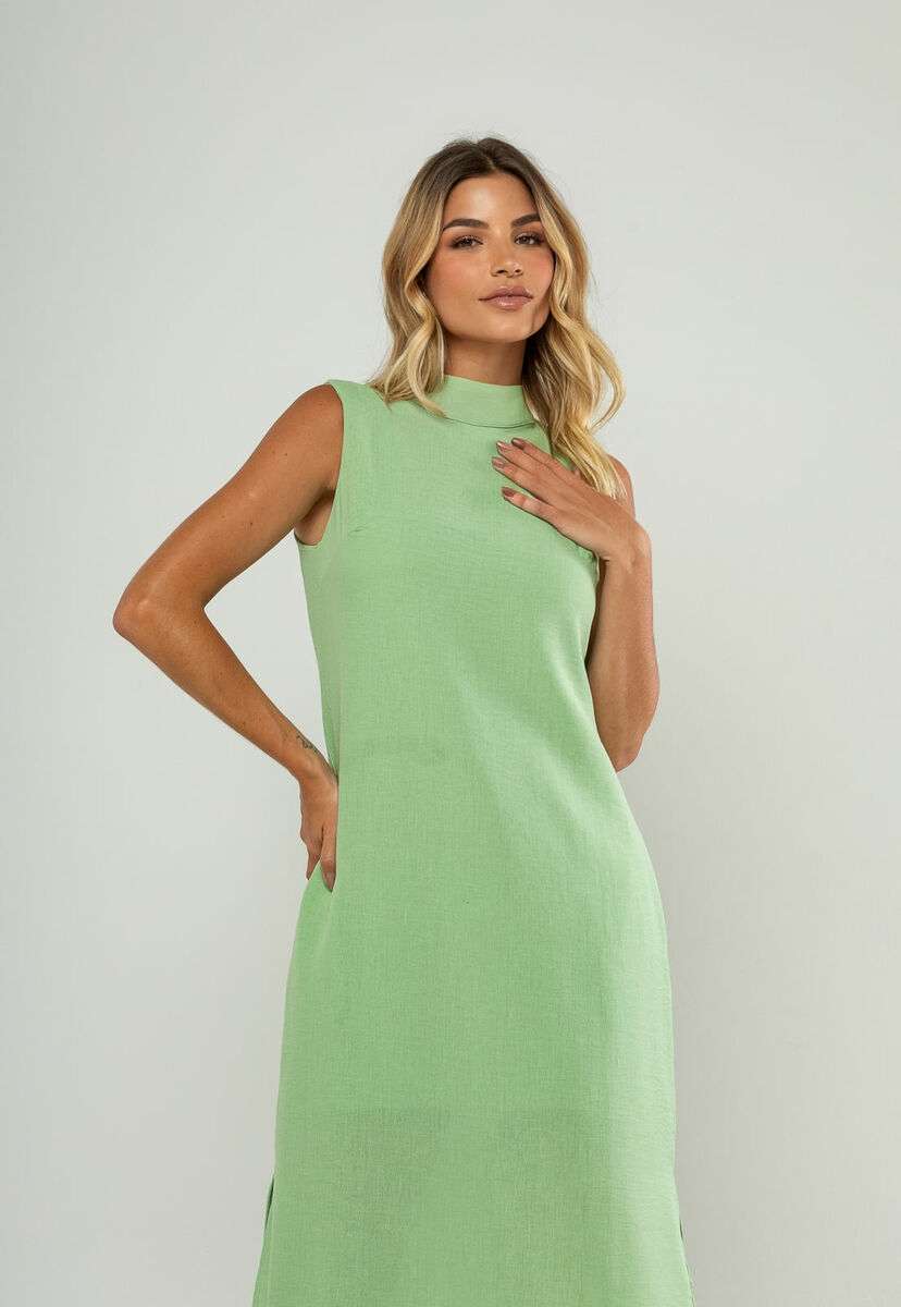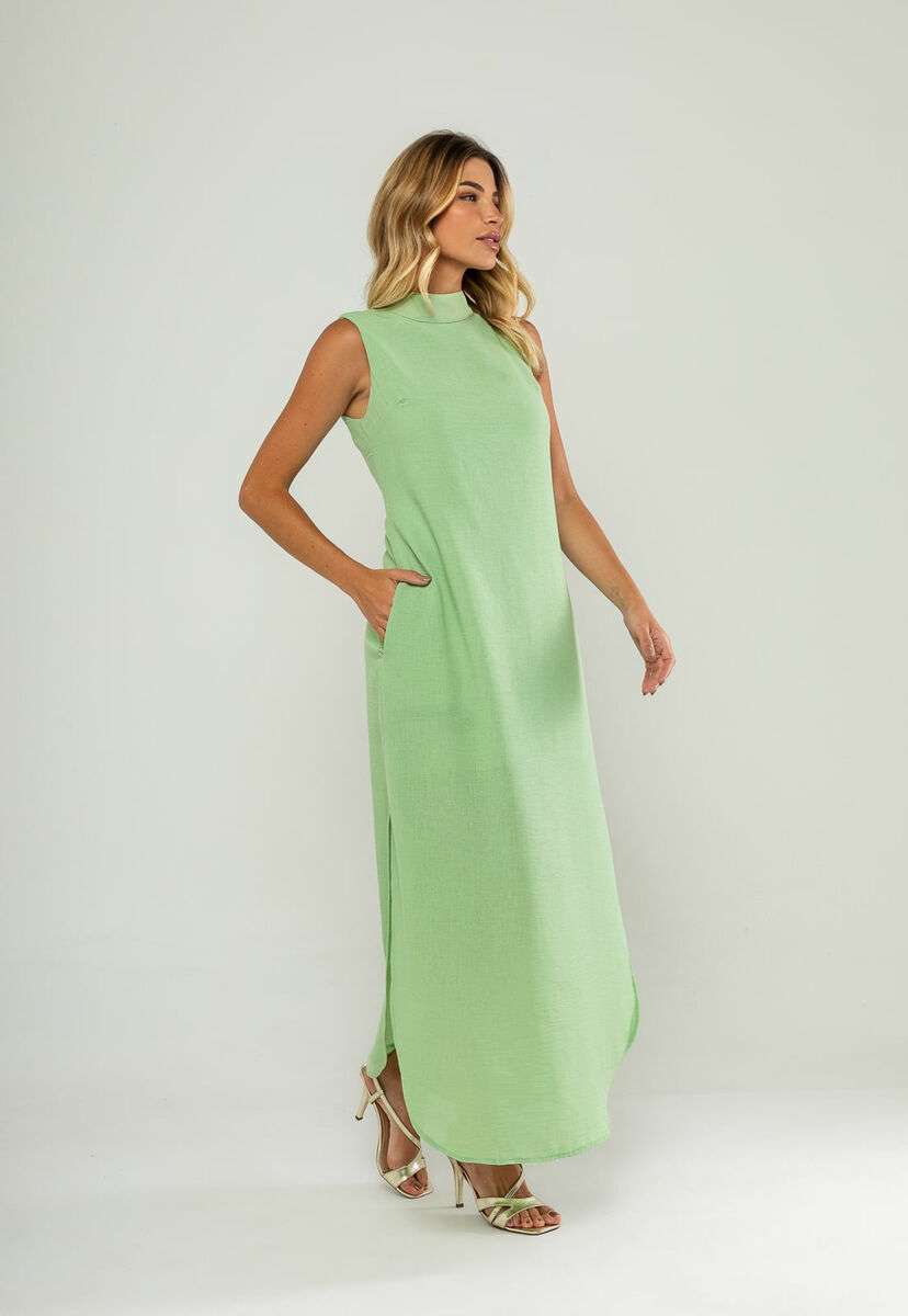 O vestido longo feminino com gola alta combina elegância minimalista e conforto em uma peça moderna e versátil. Desenvolvido em tecido leve e com toque suave, ele oferece caimento fluido e sensação de frescor, ideal para dias quentes ou produções sofisticadas e descomplicadas. O modelo possui forro, garantindo segurança e conforto ao vestir.A modelagem reta e sem mangas traz um visual clean e atemporal, valorizando o corpo de forma natural. A gola alta estruturada adiciona personalidade e um toque contemporâneo ao look. As fendas laterais proporcionam movimento e leveza, deixando o visual ainda mais elegante e estiloso.Para maior praticidade, o vestido conta com bolsos laterais funcionais, perfeitos para o dia a dia. A peça é extremamente versátil e transita facilmente entre ocasiões casuais e produções mais elaboradas. • Possui forro • Modelagem reta • Gola alta estruturada • Fendas laterais que ampliam o movimento • Bolsos laterais funcionais Modelo veste tamanho P. Medidas da modelo: Altura 1,73cm | Busto 86cm | Cintura 67cm | Quadril 99cmComposição: 100% Poliéster. Forro: 100% Poliéster.