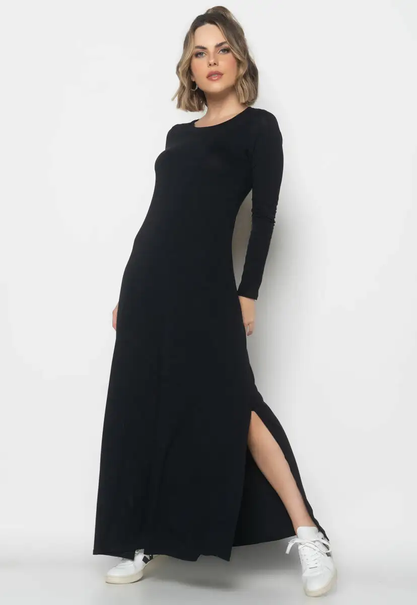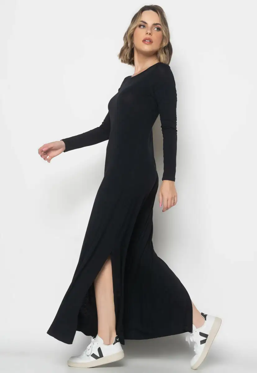 Vestido Longo Manga Longa Malha Fashion Preto