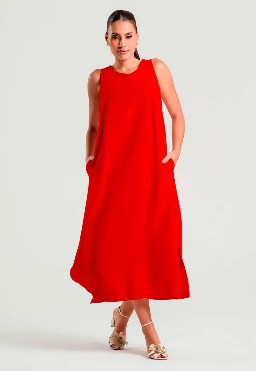 Refresque seus dias com o charme descontraído do vestido midi regata com fendas laterais e bolsos. Essa peça é a escolha ideal para quem busca leveza, praticidade e um toque moderno para os looks do dia a dia. Com caimento solto e tecido de alfaiataria marrant, ele é perfeito para os dias quentes, passeios ao ar livre, férias ou produções urbanas minimalistas.O design sem mangas aliado à modelagem reta proporciona liberdade de movimentos e muito frescor. Já as fendas laterais e os bolsos trazem um diferencial moderno e funcional, tornando o vestido ainda mais versátil e estiloso. Modelagem midi retaFendas laterais discretasBolsos lateraisModelagem regata Medidas da modelo: Altura 1,72cm | Busto 83cm | Cintura 63cm | Quadril 97cm | Manequim 38Modelo veste P Composição: 90% Viscose, 10% Poliéster.