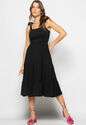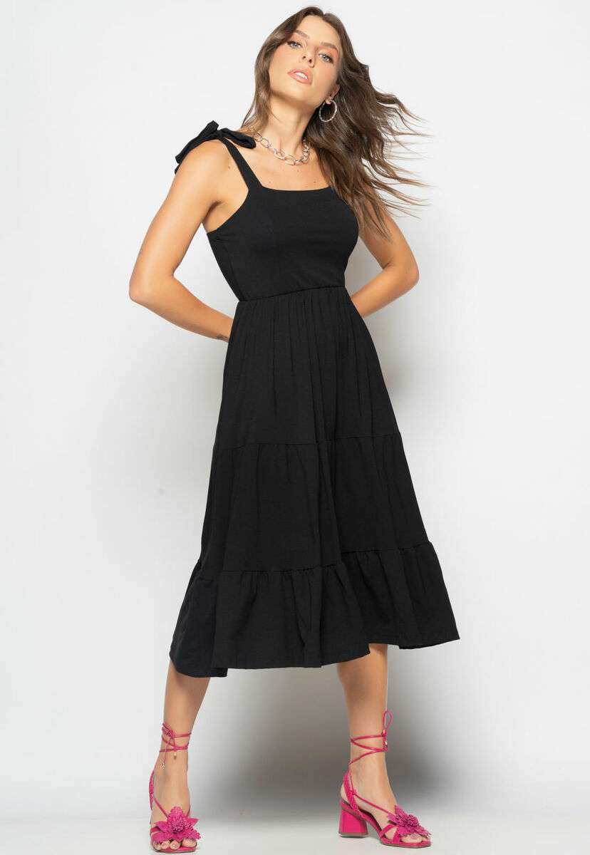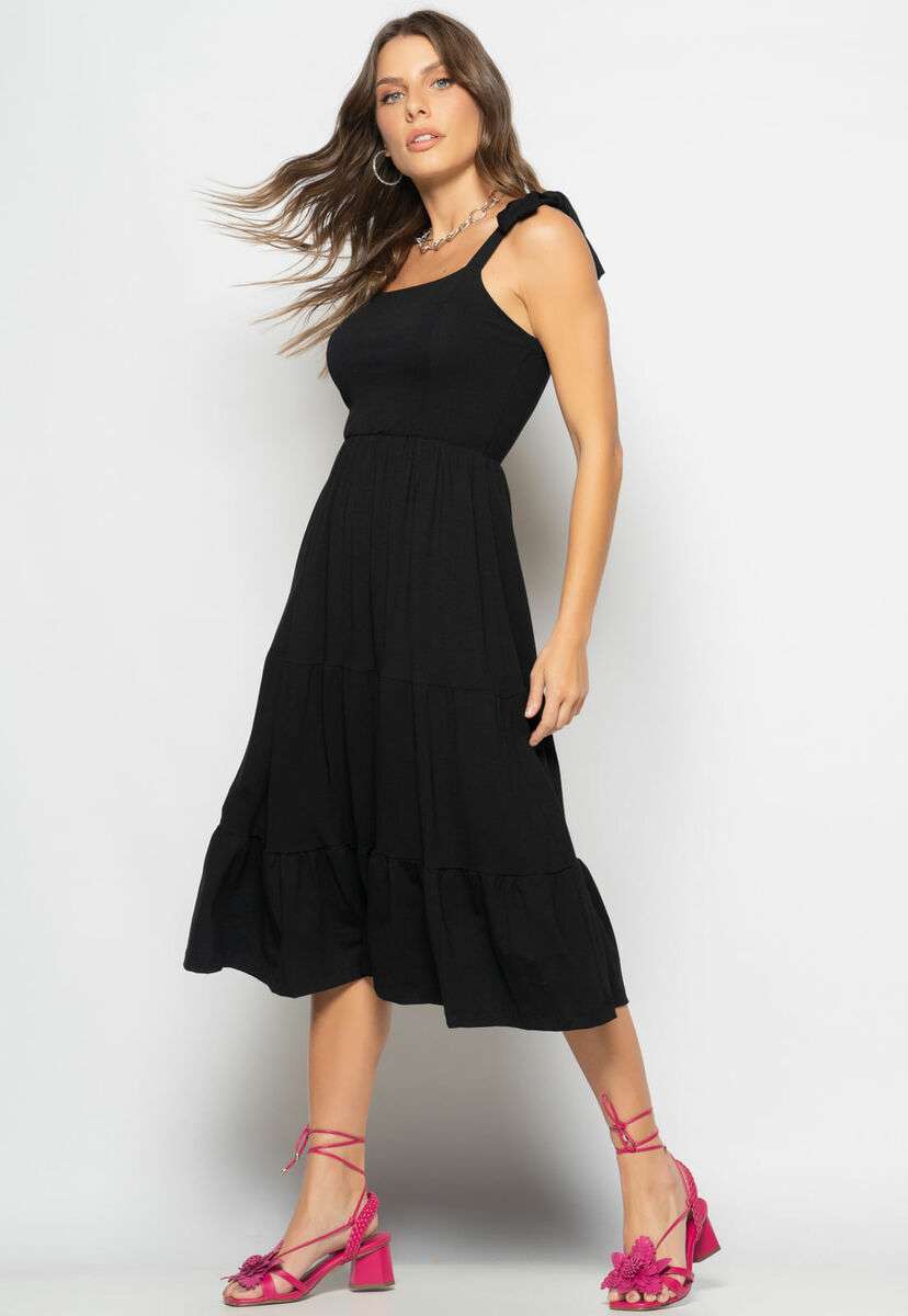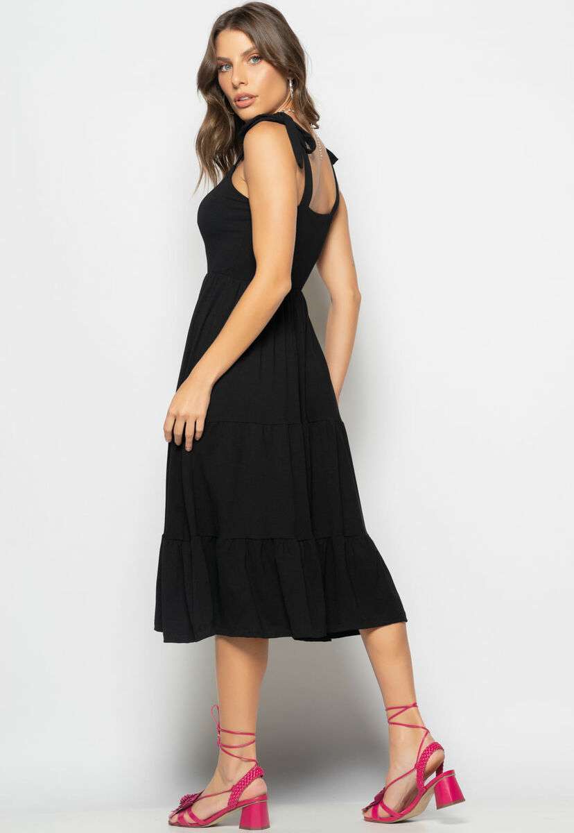Vestido Midi Babado Com Alça Amarração Malha Preto Salvatore