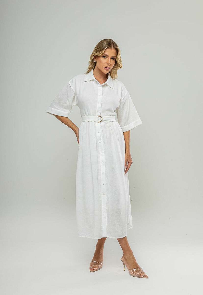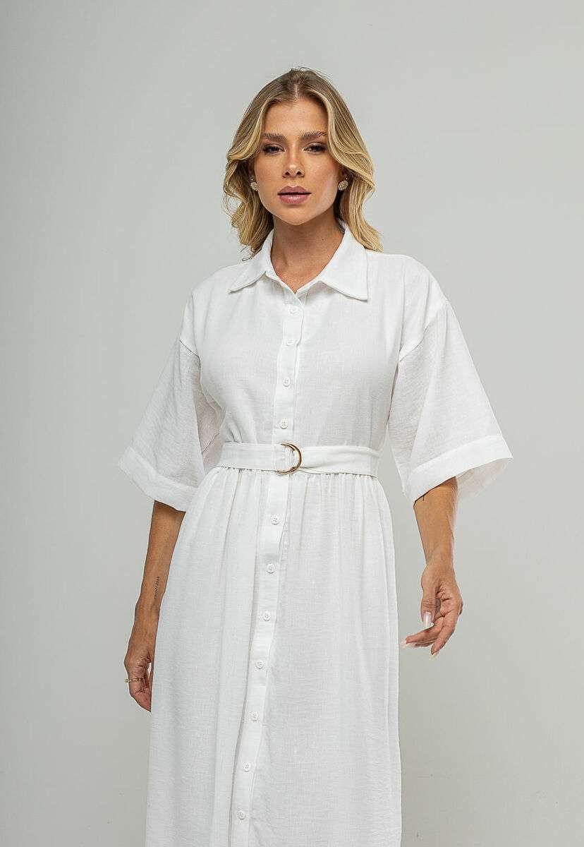Com visual elegante e funcional, este vestido midi chemise é uma peça-chave para quem busca sofisticação com conforto. O fechamento frontal por botões permite ajustar o decote conforme a proposta do look, enquanto a faixa com fivela marca a cintura de forma sutil, valorizando a silhueta sem limitar os movimentos.Confeccionado em tecido leve e respirável, o modelo conta com forro interno, oferecendo segurança, melhor acabamento e conforto no uso. As mangas mais amplas trazem um toque moderno e equilibram o comprimento midi, resultando em um visual harmônico e atemporal.Versátil e fácil de combinar, esse vestido transita bem entre ambientes profissionais, compromissos diurnos e ocasiões casuais mais arrumadas. Combine com sandálias, salto bloco ou rasteiras para diferentes propostas. • Fechamento frontal com botões • Possui forro interno • Modelagem midi • Acompanha cinto/faixa com fivela • Mangas amplas Modelo veste tamanho P. Medidas da modelo: Altura 1,73cm | Busto 86cm | Cintura 67cm | Quadril 99cm Composição: 100% Poliéster. Forro: 100% Poliéster.