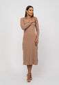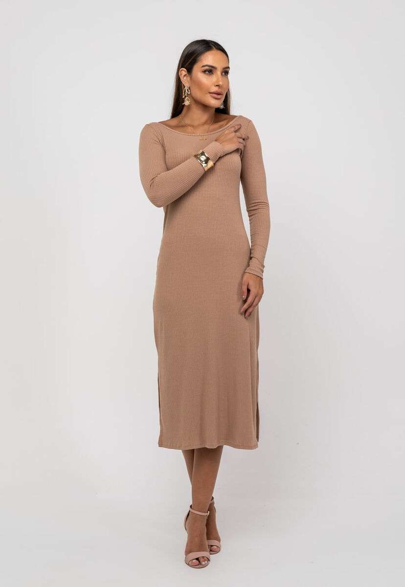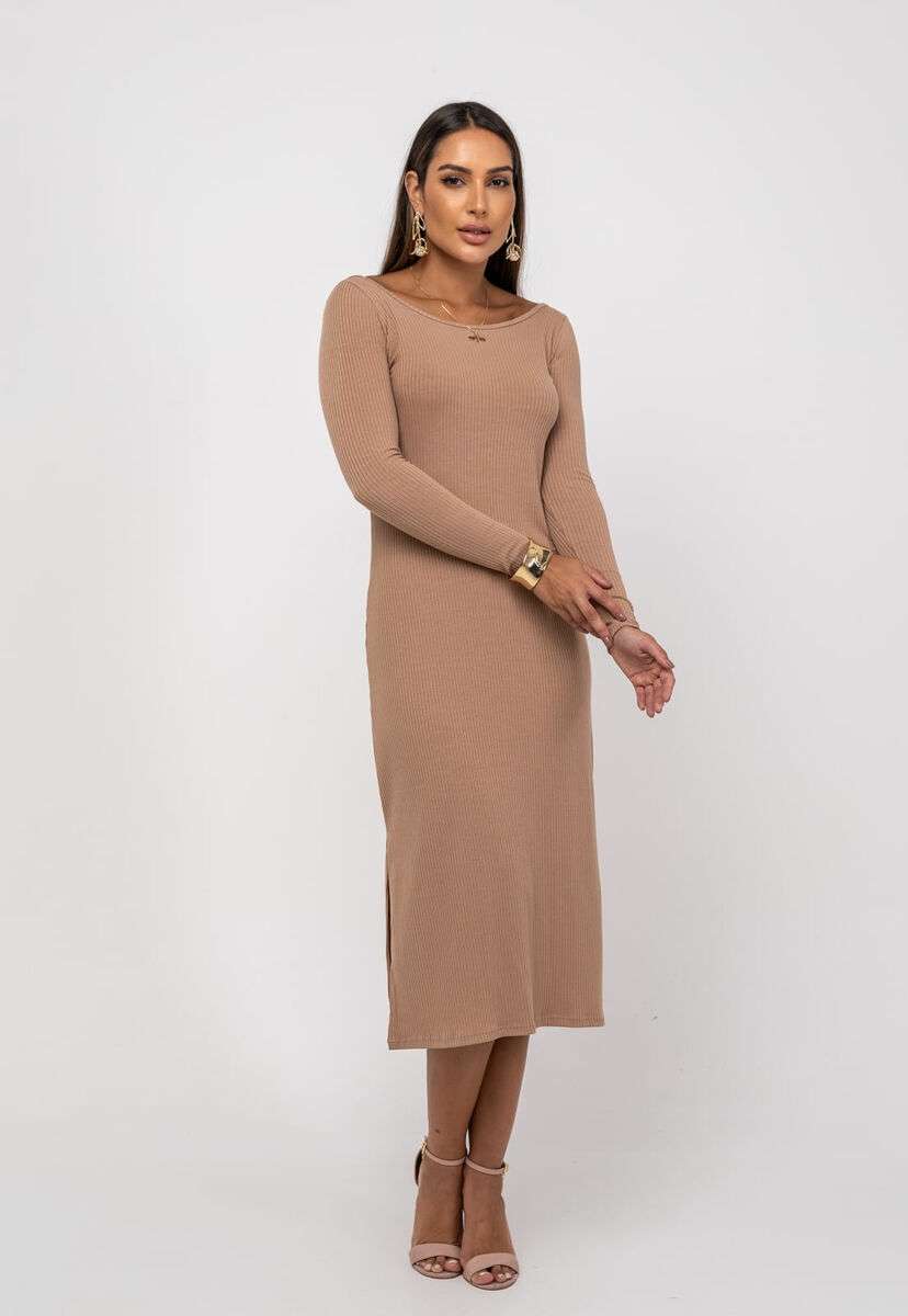 Vestido Midi M/L Decote Canoa Canelado Bege Salvatore