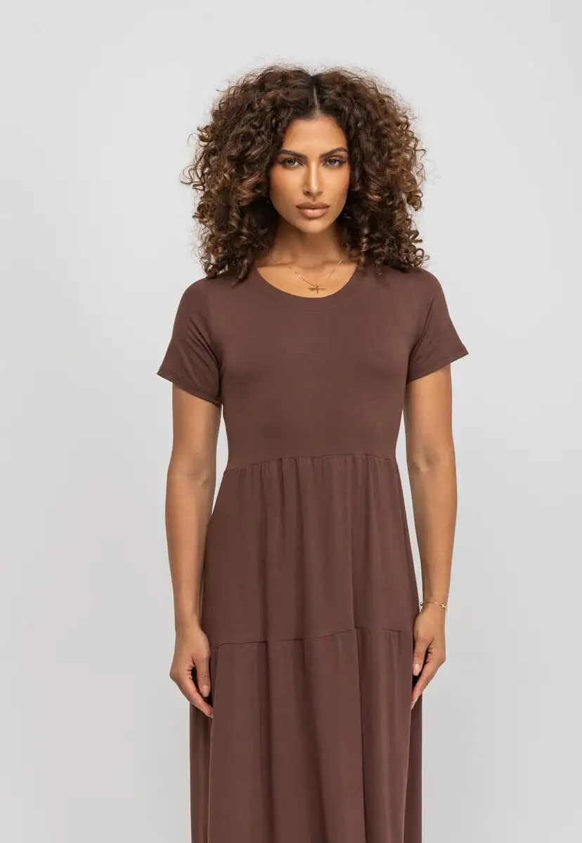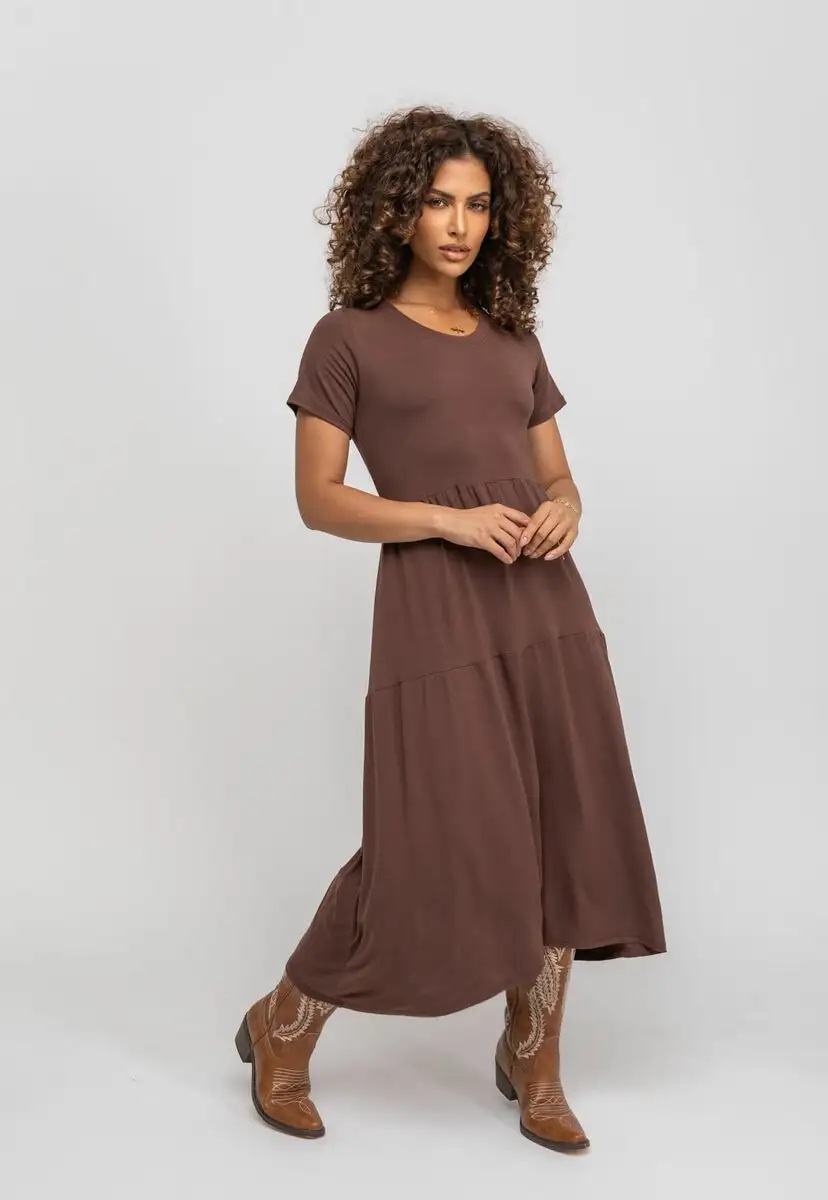 Este vestido de modelagem ampla é a escolha perfeita para quem busca conforto e estilo.Com comprimento midi, manga curta e decote redondo, ele combina elegância e praticidade para o dia a dia.O charme extra fica por conta dos delicados babados, que garantem um caimento fluido e gracioso, proporcionando movimento e leveza a cada passo.Ideal para diversas ocasiões, é um verdadeiro romântico que pode ser usado de segunda a segunda, sem perder o frescor e a sofisticação.Confeccionado em tecido de alta qualidade, com excelente elasticidade e toque super macio, o modelo se adapta ao corpo de forma confortável, garantindo liberdade de movimento e bem-estar ao longo de todo o dia.Confeccionado em tecido de alta qualidadeManga curtaModelagem amplaDetalhes em babados Medidas da modelo: Altura 1,70cm | Busto 88cm | Cintura 61cm | Quadril 92cm | Manequim 36Modelo veste PComposição: 96% Viscose, 4% Elastano