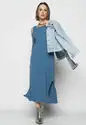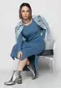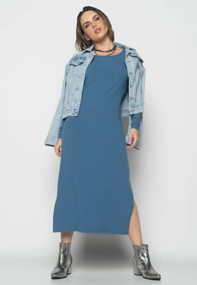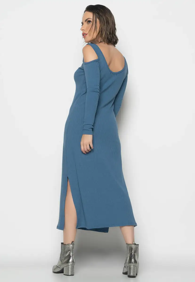 Vestido Midi Ombro Vazado Manga Longa Canelado Fashion Azul Jeans